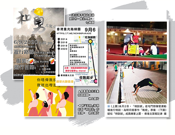 有「勇武」成員則透露,有多名攬炒派區議員撐腰的「特訓組」亦計劃在當日參與行動,最近加緊訓練準備開戰。香港文匯報記者9月2日晚在「屯門特訓組」宣稱的屯門鄧肇堅運動場觀察,發現參與者與今年3月相比明顯減少,但仍有十多人參與,有關訓練與一般跑步練習沒有太多不同,只見各人在「教練」的指揮下,先後進行為時約兩小時的掌上壓、短途衝刺及中長途跑步訓練。