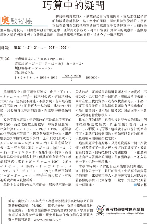 改數字看來容易,但若果改的不是最右項底下的數1999,而是改指數上的數字,那就會難起來,比如計算13 - 23 + 33 - ... - 19983 + 19993,題解裏的恒等式就不管用了,因為各項都不是2次。跟題解裏2次的恒等式差不多的,也有3次的形式,比如a3 - b3 ≡ (a - b)(a2 + ab + b2)。只是這樣做下去,當中有些項比如-23 + 33 = (3 - 2)(32 + 3 ×2 + 22) = 22 + 2 × 3 + 32,看起來就不簡單。沿着這個思路好像會挺多曲折,但其實也有辦法的,就是把算式化成13 + 23 + 33 + ... + 19993 - 2(23 + 43 + 63 + ... + 19983) = 13 + 23 + 33 + ... + 19993 - 16(13 + 23 + 33 + ... + 9993),然後再知道13 + 23 + 33 + ... + n3 = 就可以了。有興趣的讀者可以試做看看。
