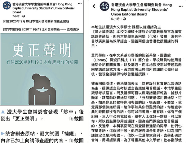 每年均有不少內地生來港修讀碩士課程,屬攬炒派的浸大學生會編委會近日借題發揮,批評中文系課程以普通話授課,更在所謂「報道」中引述學生片面之辭,「老屈」大學教師認為說粵語「很丟臉」,試圖挑起反中、仇中的情緒。編委會向教師求證後,卻發現「炒車」,歪曲了對方原意,只能刪帖及發更正聲明了事,結果惹來一眾網民狠批報道「粗疏」,甚至牽涉誹謗罪名。■香港文匯報記者 余韻