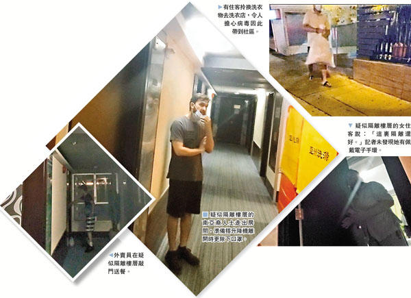 記者買了一份外賣,假扮外賣員跟隨真外賣員一同前往該疑似隔離樓層,目擊該外賣員將外賣放在一間房門口,敲門後便迅速離開,大約半分鐘後有住客開門迅速拿走外賣,然後關門。