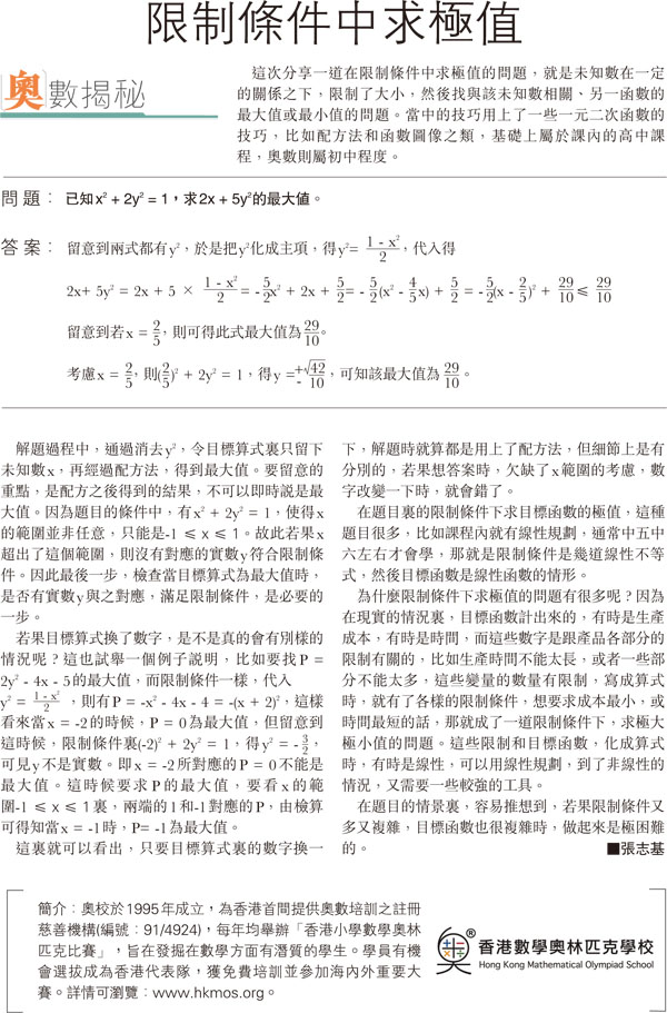 這次分享一道在限制條件中求極值的問題,就是未知數在一定的關係之下,限制了大小,然後找與該未知數相關、另一函數的最大值或最小值的問題。當中的技巧用上了一些一元二次函數的技巧,比如配方法和函數圖像之類,基礎上屬於課內的高中課程,奧數則屬初中程度。