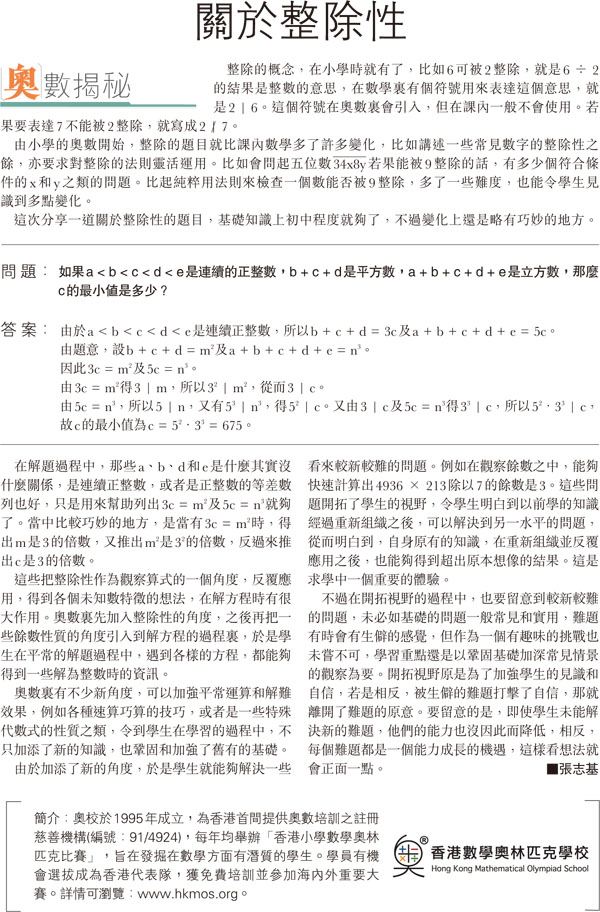 在解題過程中,那些a、b、d和e是什麼其實沒什麼關係,是連續正整數,或者是正整數的等差數列也好,只是用來幫助列出3c = m2及5c = n3就夠了。當中比較巧妙的地方,是當有3c = m2時,得出m是3的倍數,又推出m2是32的倍數,反過來推出c是3的倍數。