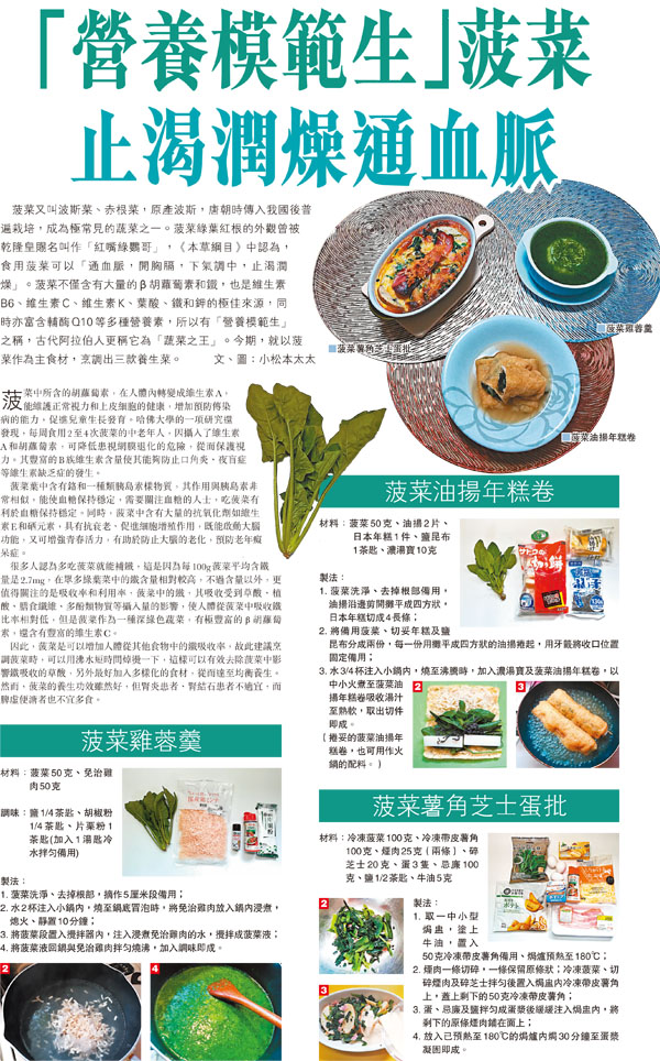 菠菜又叫波斯菜、赤根菜,原產波斯,唐朝時傳入我國後普遍栽培,成為極常見的蔬菜之一。菠菜綠葉紅根的外觀曾被乾隆皇賜名叫作「紅嘴綠鸚哥」,《本草綱目》中認為,食用菠菜可以「通血脈,開胸膈,下氣調中,止渴潤燥」。菠菜不僅含有大量的β胡蘿蔔素和鐵,也是維生素B6、維生素C、維生素K、葉酸、鐵和鉀的極佳來源,同時亦富含輔酶Q10等多種營養素,所以有「營養模範生」之稱,古代阿拉伯人更稱它為「蔬菜之王」。今期,就以菠菜作為主食材,烹調出三款養生菜。 ■文、圖︰小松本太太