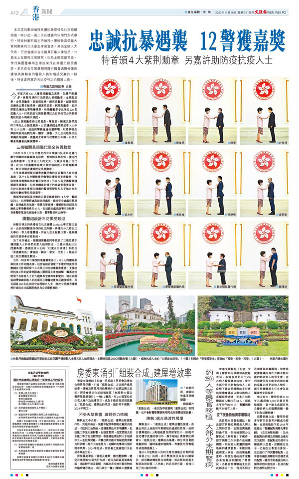 另外,特首昨日頒授的榮譽勳章得主,有9人因積極參與抗疫工作而獲表揚,包括協助研發電子手環的物流及供應鏈多元技術研發中心有限公司行政總裁黃廣揚、支援政府抗疫工作的紀律部隊義工服務隊主席麥錦輝、籌募防疫物資予有需要人士的九龍樂善堂總幹事劉愛詩、留在武漢協助滯留確診港人的武漢亞心總醫院董事長謝俊明等。另有超過260名在抗疫中表現傑出人士,將於今明兩天獲頒授行政長官社區服務獎狀及公共服務獎狀。