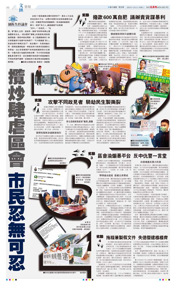 全港17區區議會在攬炒派把持下,基本上已淪為其政治宣示平台。由攬炒派擔任的多區區議會正副主席,涉嫌濫用安排會議議程、批准臨時動議等權力,縱容「自己人」藉區議會平台散播「反中」、「反政府」、「仇警」等「攬炒」主張;並縱容、推動「要求即時停止實施國家安全法」,提出購買「豬嘴」(防毒面具)等各種違規動議、撥款申請的鬧劇。在《區議會條例》缺乏對區議員行為操守的制衡下,不少區議會「素人」的誠信操守都每況愈下,疏忽職守、失德相繼出現。面對區議會亂象,特區政府只能要求區議會主席跟進,或以官員離場不參與違規議程等方式應對,令攬炒派行為越見肆無忌憚。不少市民對區議會亂象忍無可忍,多次就攬炒派的惡行到區議會及不同政府部門請願,促請政府正視及解決區議會各類問題。 ■香港文匯報記者 郭家好、黃書蘭