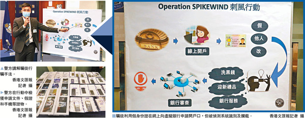 網上騙案層出不窮,連新興的「虛擬銀行」服務也成為騙徒的目標,警方連日來展開代號「刺風」行動,共偵破23宗科技罪案,共拘捕27人。其中警方首次發現有犯罪集團招攬「人頭」,利用假身份證在網上向虛擬銀行申請開戶口,但被偵測系統識別及攔截,相信犯罪集團開賬戶用來洗黑錢和接受不法資金。另外,警方偵破包括多宗網上情緣、網上購物、網上投資騙案,被捕者因借出銀行戶口代收騙款,有機會觸犯洗黑錢罪。■香港文匯報記者 蕭景源