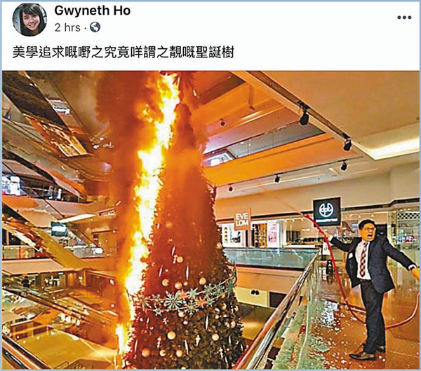 攬炒派嘅「Gil Lee」最近就喺facebook重提舊事,並貼出「火燒聖誕樹」嘅圖片,相入面除咗烈火熊熊嘅聖誕樹,仲有個神情緊張,企喺一地碎玻璃前嘗試用消防喉救火嘅商場職員。何桂藍就轉貼咗個帖文,仲寫住「美學追求嘅嘢之究竟咩謂之靚嘅聖誕樹」。唔通佢認為「火燒聖誕樹」係符合佢嘅「美學標準」? ■香港文匯報記者 倪思言