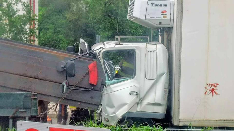 屯門發生驚險交通意外。一輛冷藏貨車,昨晨疑天雨路滑收掣不及,在輕鐵青山村站對出猛撞運載工字鐵的重型貨車,工字鐵直插入冷藏貨車駕駛室,場面驚險,冷藏車47歲司機受傷被困,消防員花近一小時始將司機救出,幸他送院後無性命危險。