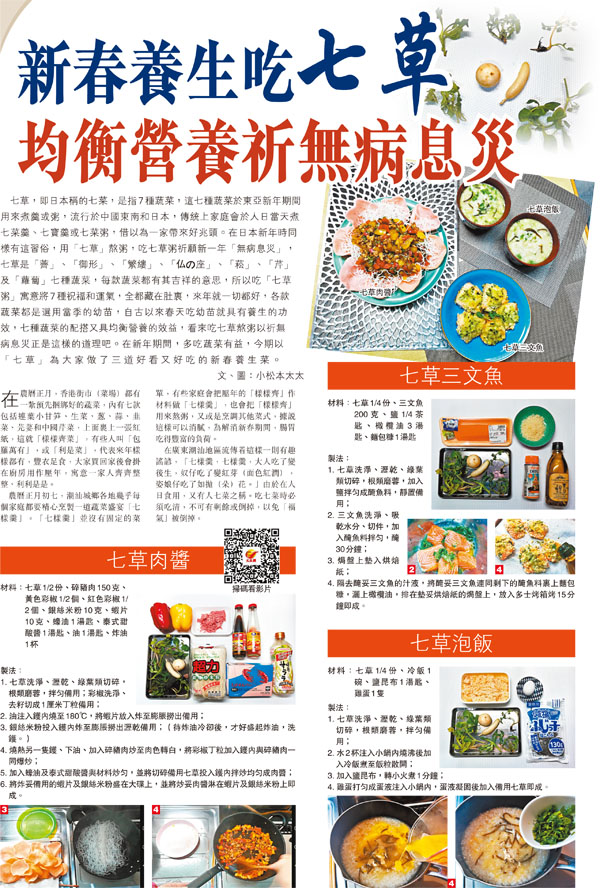 七草,即日本稱的七菜,是指7種蔬菜,這七種蔬菜於東亞新年期間用來煮羹或粥,流行於中國東南和日本,傳統上家庭會於人日當天煮七菜羹、七寶羹或七菜粥,借以為一家帶來好兆頭。在日本新年時同樣有這習俗,用「七草」熬粥,吃七草粥祈願新一年「無病息災」,七草是「薺」、「御形」、「繁縷」、「仏の座」、「菘」、「芹」及「蘿蔔」七種蔬菜,每款蔬菜都有其吉祥的意思,所以吃「七草粥」寓意將7種祝福和運氣,全都藏在肚裏,來年就一切都好,各款蔬菜都是選用當季的幼苗,自古以來春天吃幼苗就具有養生的功效,七種蔬菜的配搭又具均衡營養的效益,看來吃七草熬粥以祈無病息災正是這樣的道理吧。在新年期間,多吃蔬菜有益,今期以「七草」為大家做了三道好看又好吃的新春養生菜。●文、圖︰小松本太太