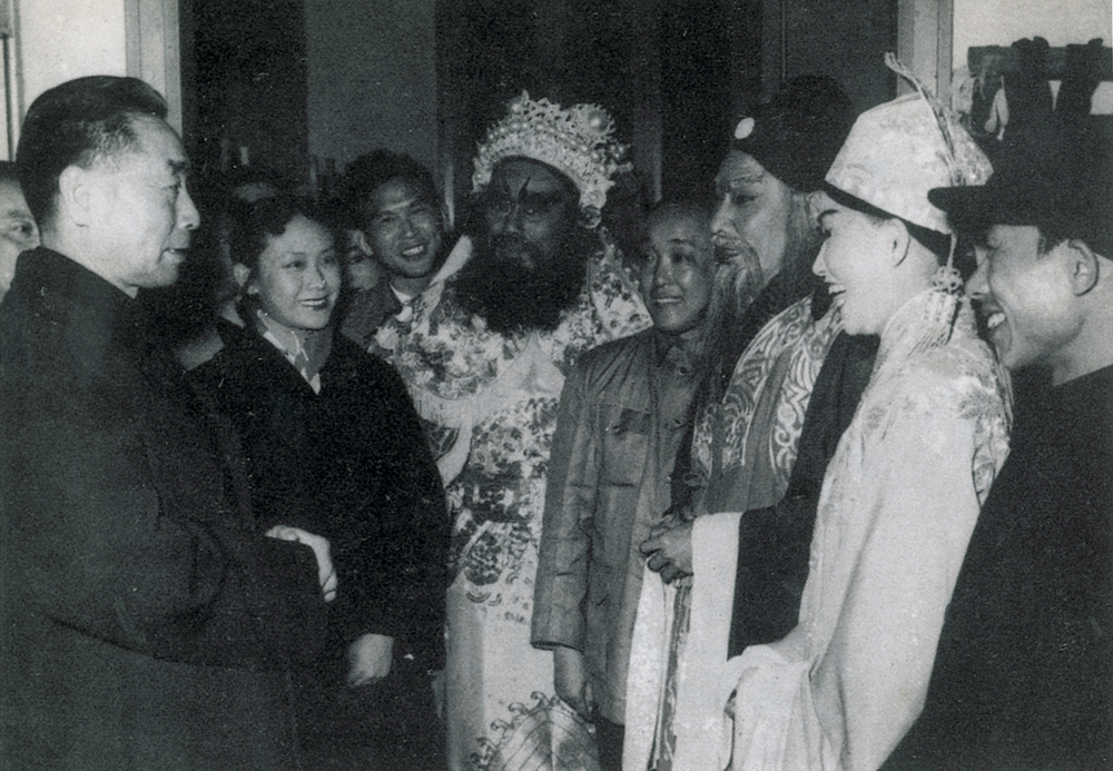 圖:一九五六年周恩來總理(左一)在北京觀看完粵劇《搜書院》後與演員傾談
