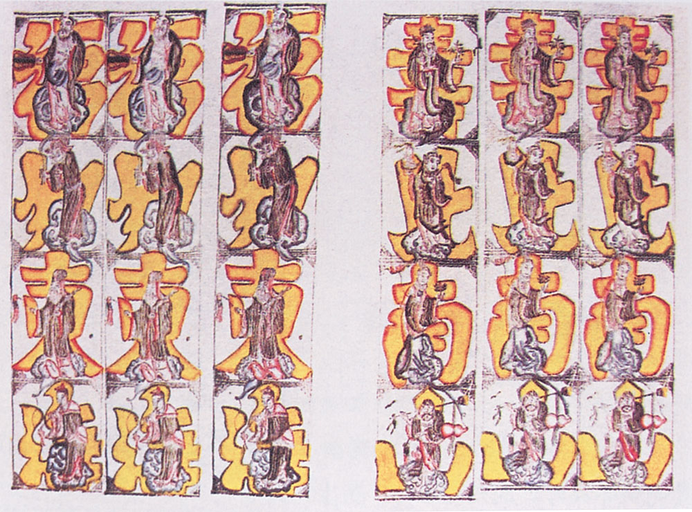 滑縣木版年畫以神像和族譜為主,因其尺寸畫幅較大,一般在139厘米左右,從而決定了其材質要求和製作工序的特殊性。滑縣木版年畫有兩種材質,紙本和布本。對於大幅中堂形式的神像和族譜,紙張要求大,為保證紙張的耐久性,在印製之前有一道「打紙裱」的工序,就是將兩張紙貼裱在一起,增加了紙張的厚度和拉力,為線版印製提供了方便。布本,一般使用土製的棉布,印製前也需在布面上做「打灰」的工序處理,方可進行印製。製作工序一般分為畫稿、刻版、印製、彩繪。滑縣木版年畫的畫版多為古版,畫稿樣式代代相傳且為家族式單傳,傳男不傳女,這一古老的傳承方式為我們完整地保存了近古農耕文明的文化和民俗信息。