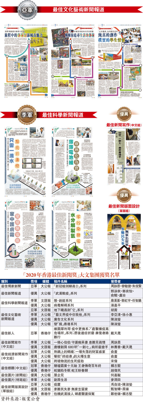 「2020年香港最佳新聞獎」參賽報館共有12家,共同競逐報道組、寫作組、圖片組及版面設計組四個組別合共75個獎項。香港大公文匯傳媒集團旗下3份報章共獲得21個獎項,包括兩個組別的冠軍(見表)。