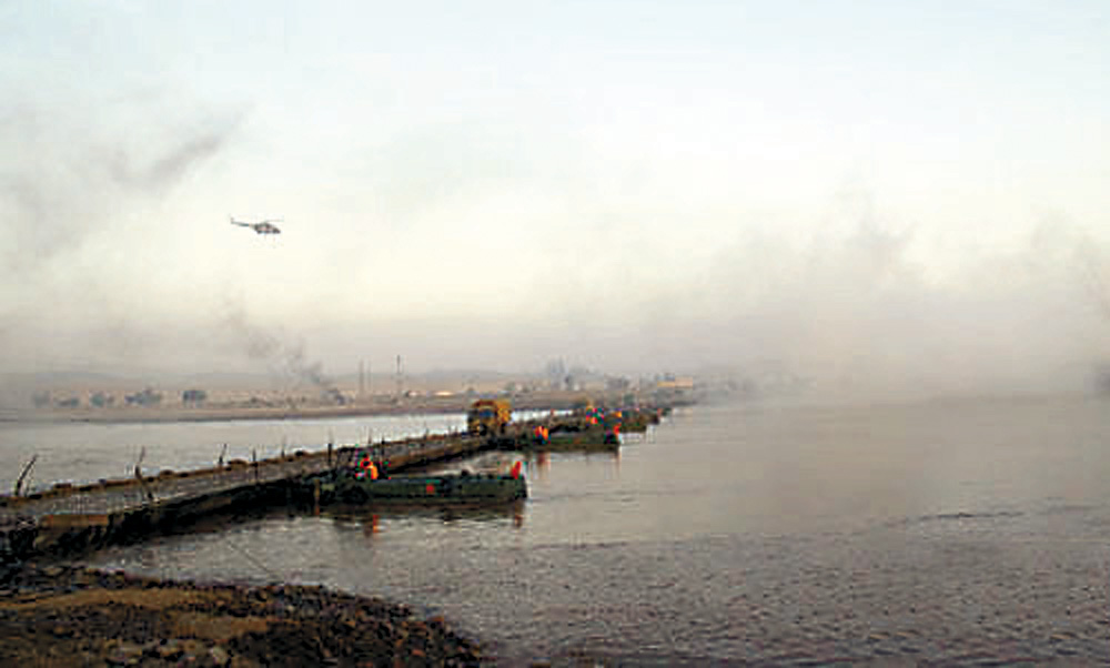 圖:「跨越-2009」系列實兵演習11日拉開序幕,圖為蘭州軍區某師摩托化部隊機動從浮橋上通過(新華網)