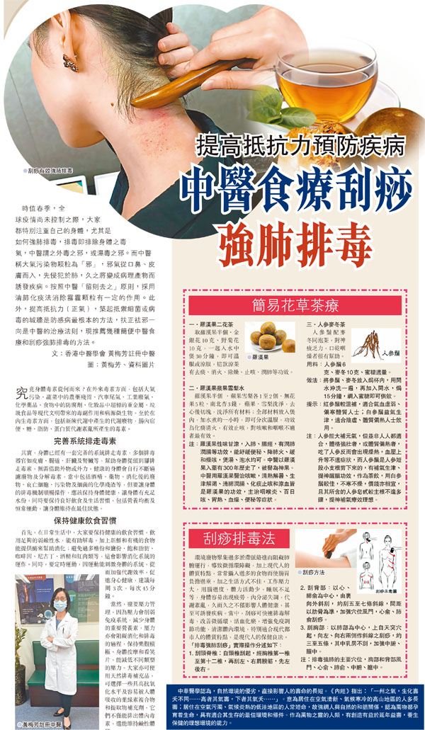 時值春季,全球疫情尚未控制之際,大家都特別注重自己的身體,尤其是如何強肺排毒,排毒即排除身體之毒氣,中醫謂之外毒之邪,或濕毒之邪。而中醫稱大氣污染物顆粒為「邪」,邪氣從口鼻、皮膚而入,先侵犯於肺,久之將變成病理產物而誘發疾病。按照中醫「留則去之」原則,採用清肺化痰法消除霧霾顆粒有一定的作用。此外,提高抵抗力(正氣),築起抵禦細菌或病毒的城牆是防感病最根本的方法,扶正祛邪一向是中醫的治療法則,現推薦幾種簡便中醫食療和刮痧強肺排毒的方法。 ●文︰香港中醫學會 黃梅芳註冊中醫 圖︰黃梅芳、資料圖片