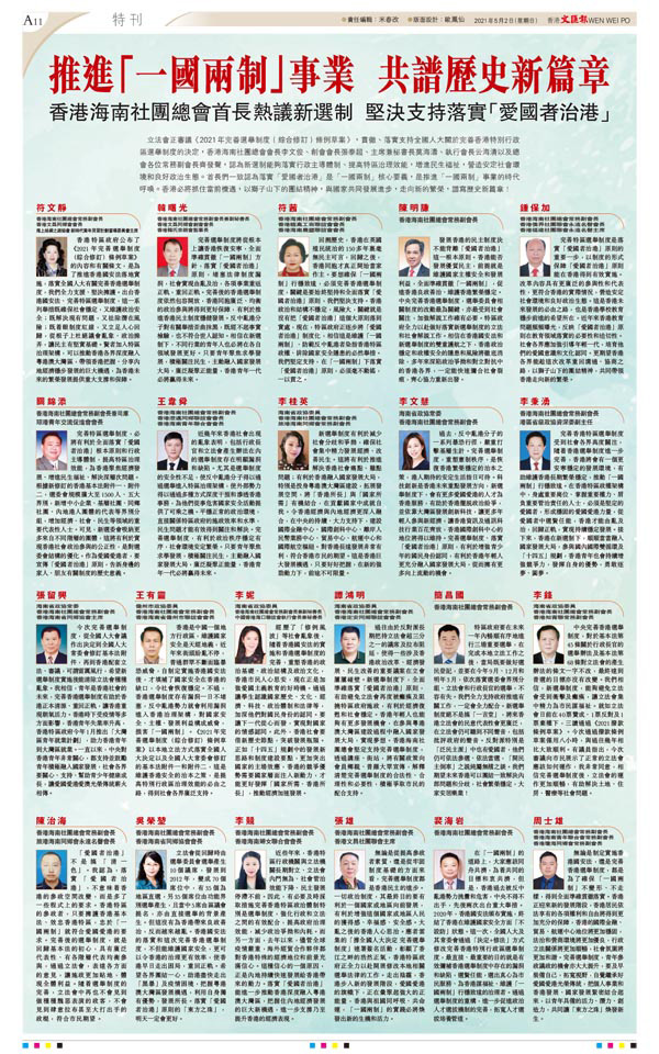 立法會正審議《2021年完善選舉制度(綜合修訂)條例草案》,貫徹、落實支持全國人大關於完善香港特別行政區選舉制度的決定,香港海南社團總會會長李文俊、創會會長張泰超、主席兼秘書長莫海濤、執行會長云海清以及總會各位常務副會長齊發聲,認為新選制能夠落實行政主導體制、提高特區治理效能,增進民生福祉,營造安定社會環境和良好政治生態。首長們一致認為落實「愛國者治港」是「一國兩制」核心要義,是推進「一國兩制」事業的時代呼喚。香港必將抓住當前機遇,以獅子山下的團結精神,與國家共同發展進步,走向新的繁榮,譜寫歷史新篇章!