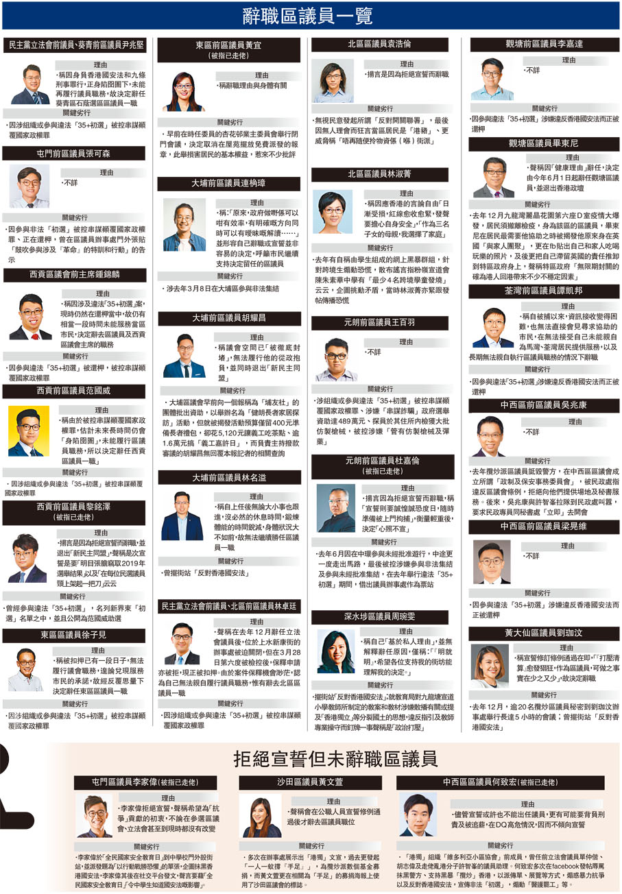 面對即將進行宣誓,逾20名攬炒派區議員近日相繼宣布辭職,當中包括因參與民主派非法「初選」而被控涉嫌違反香港國安法的民主黨立法會前議員、北區前區議員林卓廷,民主黨立法會前議員、葵青前區議員尹兆堅,東區區議員徐子見,西貢區議會前主席鍾錦麟,觀塘前區議員李嘉達,元朗前區議員王百羽,中西區前區議員梁晃維,西貢前區議員范國威,荃灣前區議員譚凱邦等。(見表)
