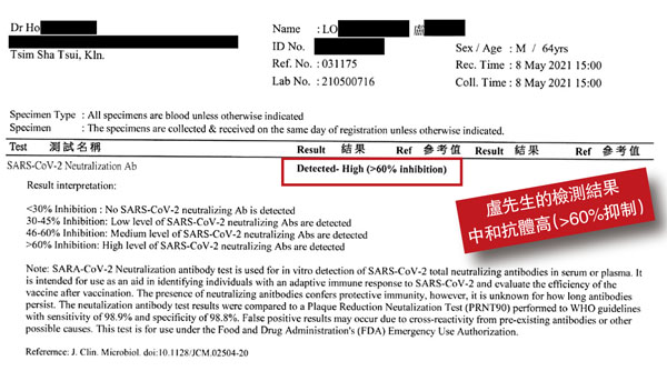 要知道疫苗有無效,進行新冠病毒中和抗體測試是有效方法。記者與關先生、盧先生上周六到醫療機構抽血進行已獲美國食品藥品監督管理局(FDA)等認證的測試,結果都錄得超過60%抑制。