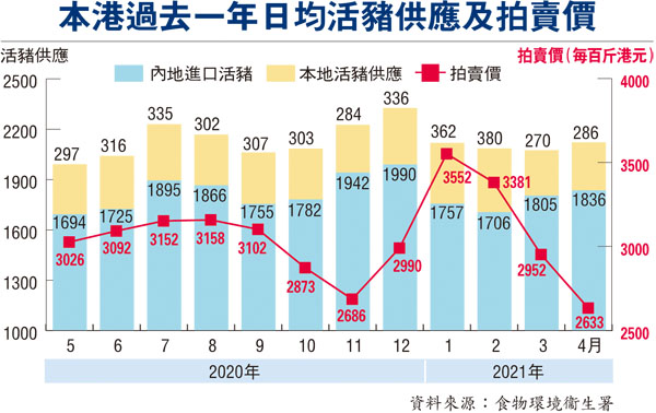 香港文匯報記者查閱食物環境衞生署資料發現,近期內地供港活豬數量顯著增加,而平均拍賣價格則持續下降。比較2021年1月與4月數據,今年1月香港從內地進口活豬共1,757頭,4月進口量上升4.4%至1,836頭。