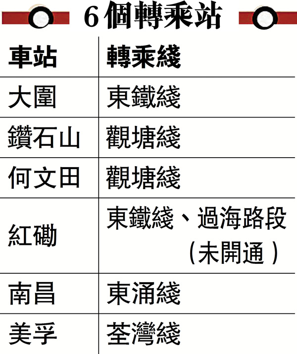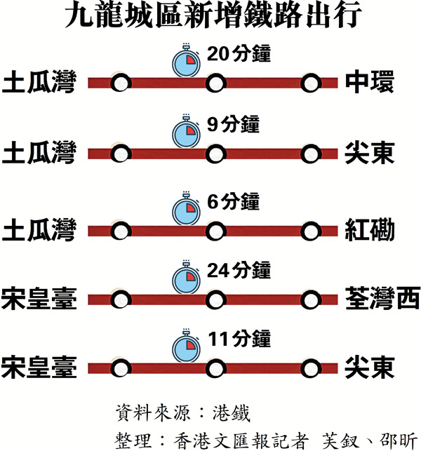 不少市民期待的屯馬綫將於下月27日全綫通車,新增的土瓜灣站與宋皇臺站將連接紅磡站及啟德站,讓九龍城區日後四通八達,由土瓜灣去中環只需20分鐘。屯馬綫全長56公里、共27個車站,是港鐵最長的路綫,全程耗時73分鐘,車費23.5元。港鐵表示,由通車日至下年1月1日,乘客於土瓜灣站、宋皇臺站、啟德站及顯徑站出入閘可享車費優惠,成人八達通每次可減1元車費,長者及小童等其他八達通卡每次可減5毫。●香港文匯報記者 邵昕、芙釵