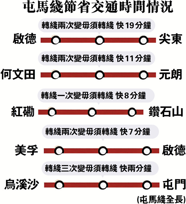 屯馬綫全綫通車後,烏溪沙直達屯門只須73分鐘。運輸及房屋局局長陳帆昨日在會見記者時宣布,屯馬綫將於下月27日全綫通車。他表示,屯馬綫設有6個轉乘站,可以接駁至東鐵綫、觀塘綫、荃灣綫及東涌綫。在繁忙時間,屯馬綫將會以3分鐘一班車運行,相信其開通能夠有助分流大圍至九龍塘站的市民,減輕東鐵綫壓力,讓市民旅途更暢通無阻。
