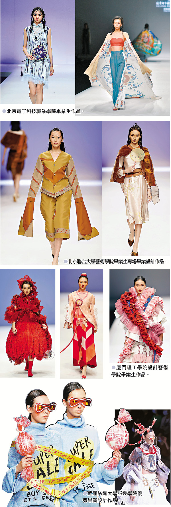 閩南理工學院服裝與藝術設計學院畢業生作品發布在北京中國國際大學生時裝周舉行,以「回源·智尚」為主題,畢業生們盡展四年所學,用服裝語言彰顯「智創衣尚」的青春思考,盡顯服裝新生代追求新智設計的衣風尚。廈門理工學院設計藝術學院畢業生作品亮相T台,發布會主題為「一起」,一起探索解決之道、一起構建人類命運共同體,其58套服裝作品均出自該校服裝與服飾設計專業應屆本科畢業生之手。