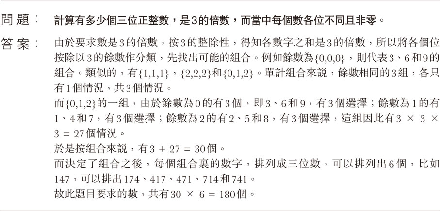 另外還有餘數為{0,1,2}的情況,當中餘數為0的情況,能選擇0、3、6和9,但0又不能是百位,於是又要分類,情況就複雜了許多。這裏就會看出,題目裏各數字非零,就能確保所選擇的數字1至9之中,選出來的,都能任意地做百位、十位或者個位,毋須看有沒有數字不能放在百位之類,實在令題目運算過程簡化很多。