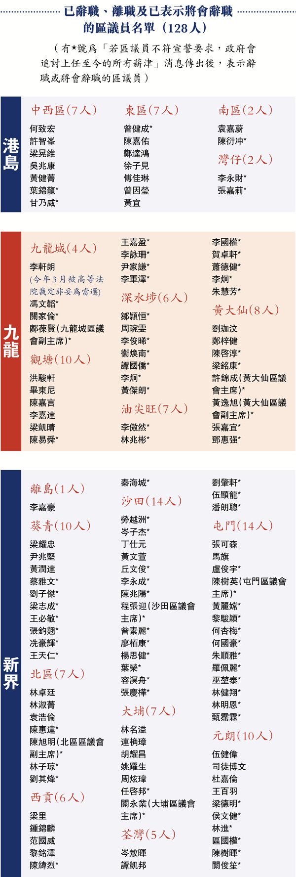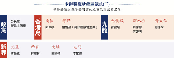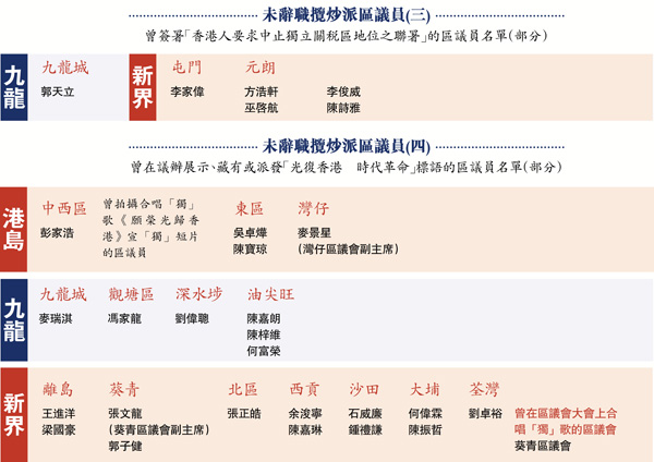 據消息指,跌入DQ負面清單的共有4類人,除參與攬炒派非法「初選」、簽署「墨落無悔 堅定抗爭」抗爭立場聲明書外,去年中曾簽署「香港人要求中止獨立關稅區地位」聯署聲明,以及曾在議員辦事處內展示「光復香港、時代革命」「港獨」口號,涉提倡「港獨」,亦極可能被褫奪區議員資格。據了解,預計約230名區議員不符合宣誓要求。消息傳出後,超過80名攬炒派區議員由前晚深夜至今日凌晨零時紛紛辭職(見表)。