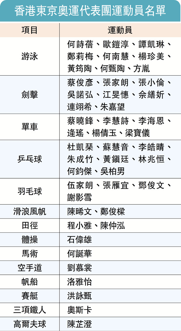東京奧運會定於本月23日至8月8日舉行。香港代表團將派出97人遠赴東京,當中包括46名運動員出戰38個項目的比賽,涵蓋13個運動大項。在行政長官林鄭月娥、中聯辦副主任盧新寧、民政事務局局長徐英偉以及一眾嘉賓的見證下,港協暨奧委會會長霍震霆、東京奧運中國香港代表團團長貝鈞奇以及港協暨奧委會義務秘書長王敏超代表港隊接過香港特區區旗,意味着東京奧運備戰已進入最後階段,而23日晚奧運開幕典禮的港隊持旗手則由羽毛球選手謝影雪及劍擊運動員張家朗擔任。