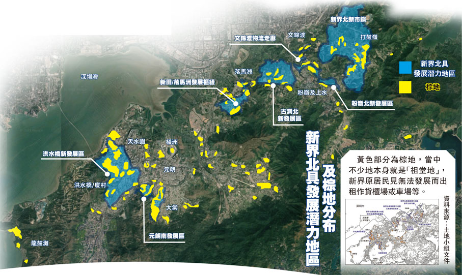 全港目前約有7,300個新界宗族的「祖」或「堂」,他們合共持有約2,400公頃土地(俗稱「祖堂地」),部分地段更與政府有意發展的農地、棕地等範圍重疊(見另稿),當中為數不少都因不同原因而一直未有發展,任由土地養草「曬太陽」。