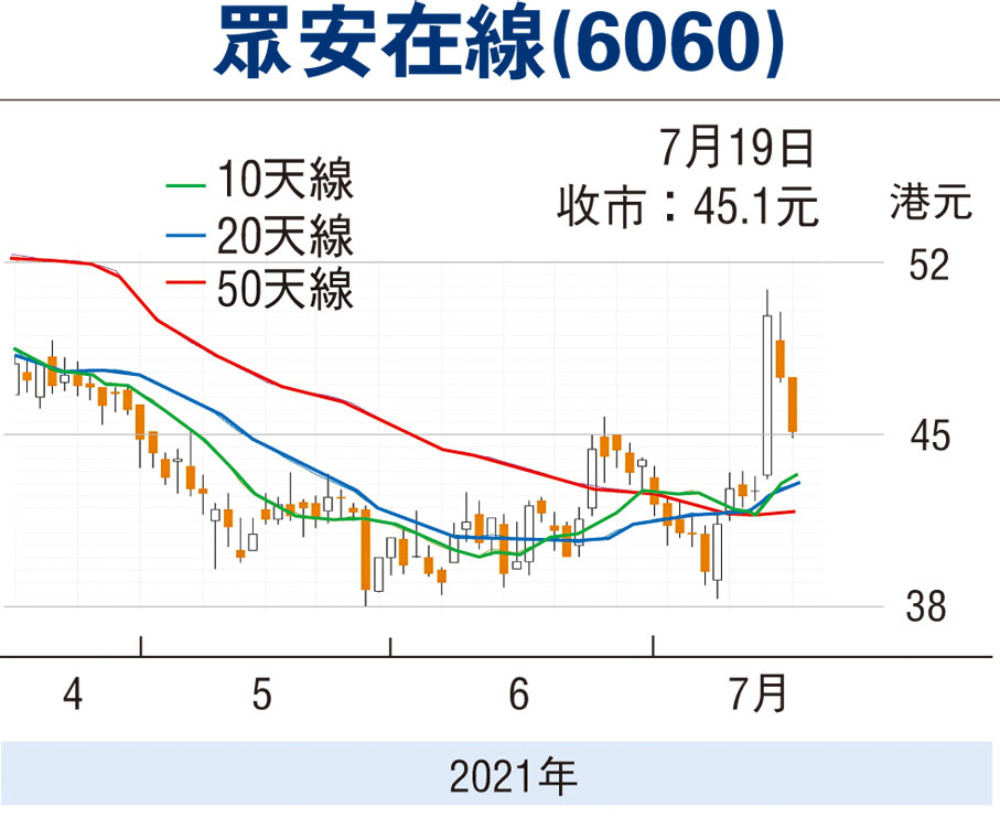 眾安在線(6060)憑藉優異業績,由7月9日最低價38.35元快速漲至7月15日最高價50.85元始遇阻回落,股價昨收45.1元。作為AH兩地眾多上市險企中業績增長領先企業,眾安在線連續大漲突破120天線,值得留意。