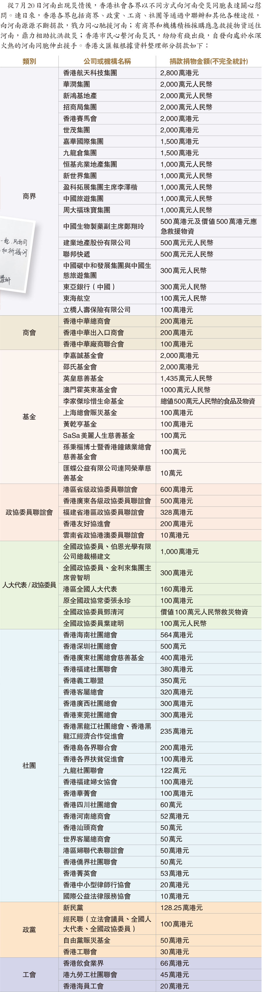 河南多個地方7月20日經歷極端暴雨襲擊釀成洪災,尤其在省會鄭州市,軌道與地面交通全部中斷,多個小區、醫院停水停電斷網,更造成人命傷亡和財產損失。河南災情傳來,香港市民感同身受,踴躍捐錢捐物賑災,20元、50元、100元、500元甚至是成千上萬元的個人捐贈背後,凝聚的是市民巨大的愛心,也展現出市民對內地同胞血濃於水的深厚情誼。有市民用紙筆記錄下這種血脈相連、患難與共的體會:「天災無情,人間有愛,只要我們風雨同舟、守望相助,相信沒有戰勝不了的困難,河南加油!」●香港文匯報記者 子京