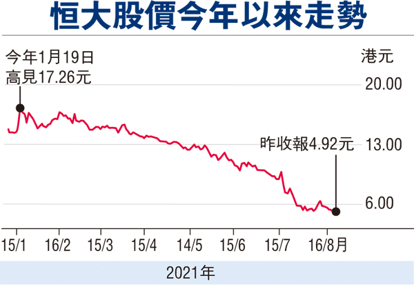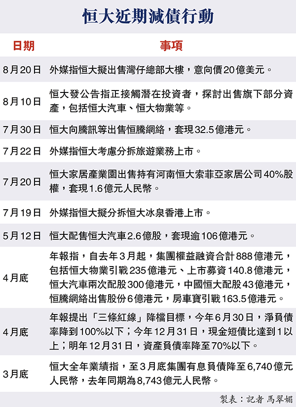 在內地近年收緊融資「三道紅線」下,恒大債務問題近年備受市場關注,傳中央早前已要求恒大總部所在的廣東省政府就恒大債務問題提出初步方案,包括協調資產端的合作等,防止風險擴散。近年積極「賣產減磅」並加強資金回籠的恒大,本月初曾發公告承認,正在接觸幾家潛在獨立第三方投資者,探討有關出售旗下部分資產,恒大汽車(0708.HK)及恒大物業(6666.HK)均榜上有名。