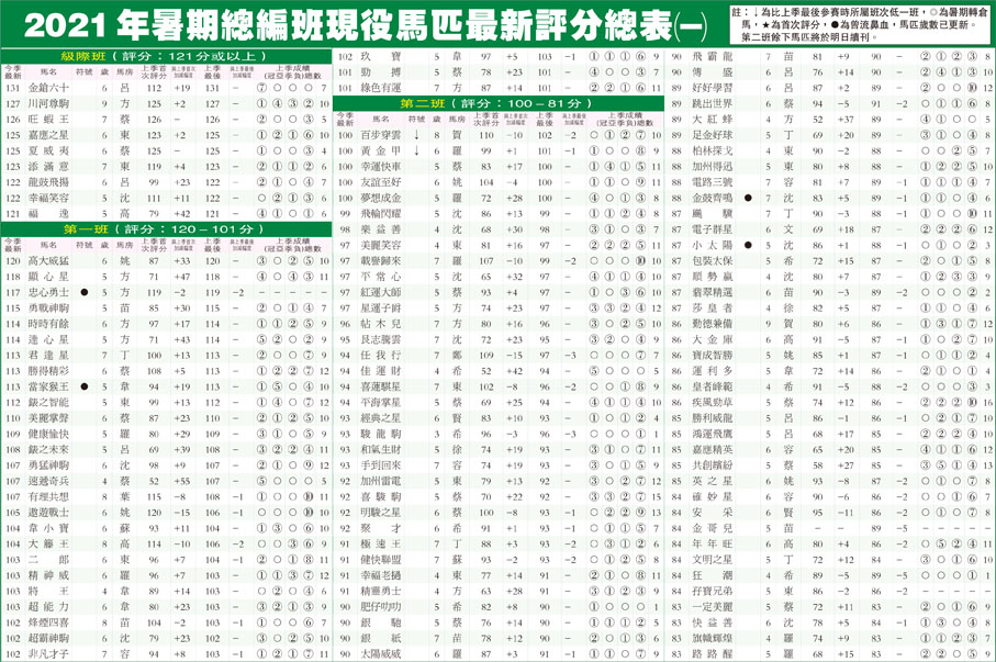 2021年暑期總編班現役馬匹最新評分總表(一)