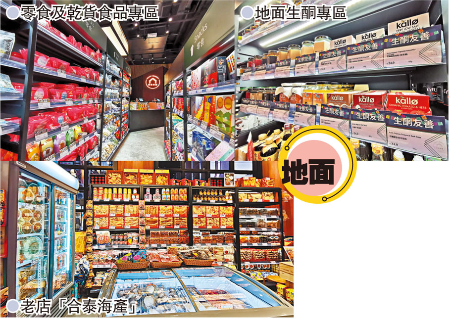 除了本地老字號品牌外,地面樓層亦設多個品牌專門店,當中包括專營海味的老店「合泰海產」、被喻為健康營養食品的 「萊茵衣藻麵」、提供多款不同種類的國際品牌食品的「龍宮」、法式餅店 「Les Lunes a Deux」的糕點,以及來自西班牙「Pata Negra House」風乾火腿等食品。
