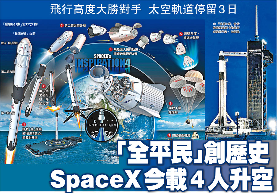 繼7月兩家私人航天企業成功進行首次太空旅遊後,美國電動車企業Tesla創辦人馬斯克旗下的太空探索公司SpaceX,亦將最早於香港時間今晨8時展開首次太空之旅。與對手維珍銀河及藍色起源不同,SpaceX今次載人任務無論是升空高度及停留時間都更勝一籌,更是史上首次「全平民」班底飛上太空軌道,可能較此前兩次在太空邊緣打「擦邊球」的太空旅遊,更具歷史意義。