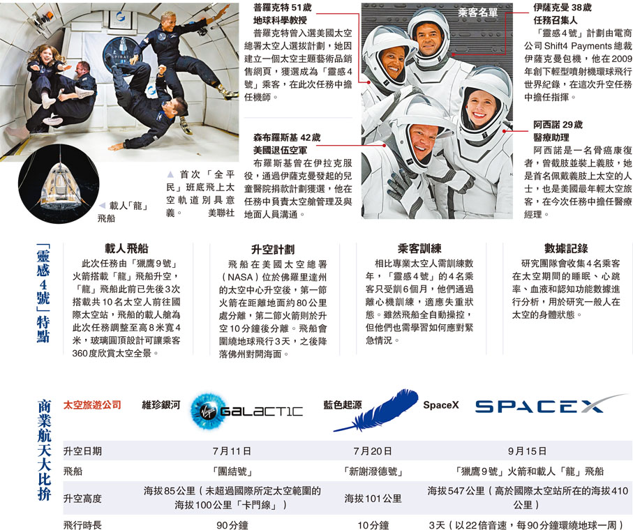 相對於維珍銀河及藍色起源7月送旅客上太空時,都安排專業太空人伴飛,這次「靈感4號」4名乘客都是沒有受過專業訓練的平民。4人包括個人獨資「包起」整趟旅程的38歲電商公司老闆伊薩克曼、51歲地球科學教授普羅克特、42歲退伍空軍兼航空數據工程師森布羅斯基,以及29歲的醫療助理阿西諾。