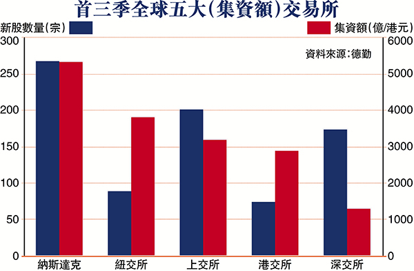 內地對多個行業加強監管,影響到企業來港IPO。德勤中國昨日發布今年首三季度內地及香港新股市場分析,預計本港市場至9月底新股集資額為2,885億元,排在納斯達、紐約證券交易所和上海證交所之後,失去三甲地位。該行並輕微下調今年本港新股市場預測,預料全年有110隻至120隻新股上市,集資規模近4,000億元。而該行年初預計有130隻新股及超過4,000億元集資額。●香港文匯報記者 馬曉芳、周曉菁