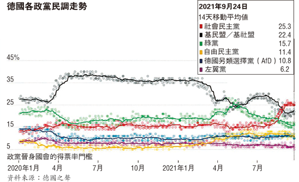 根據最新民調,左翼的社會民主黨(SPD)和默克爾所屬的基民盟成兩強鼎立,支持度均徘徊約22%至25%,當中社民黨稍為領先。主打環保議題的綠黨以16%支持度排第三,由於社民黨和基民盟已表明不會結盟,令綠黨最有機會成為造王者,親商界的自由民主黨(FDP)和極右立場的德國另類選擇黨(AfD),支持度均約10%,最終哪個政黨勝出及聯合政府如何組成,仍然充滿變數。FDP黨魁林德納預計,今次將是德國在戰後首次有總理所屬政黨,在大選得票遠遠未達1/3。