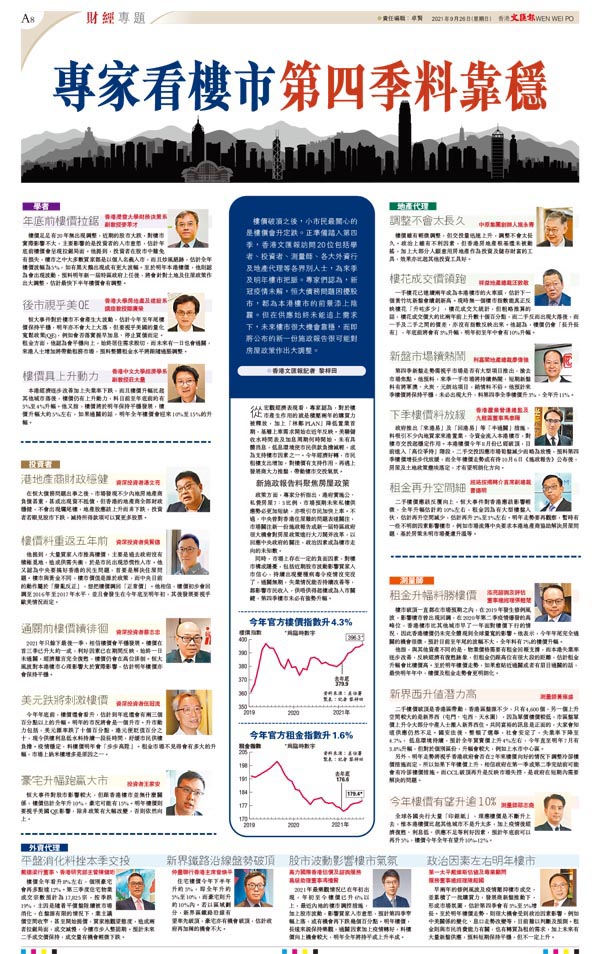 樓價破頂之後,小市民最關心的是樓價會升定跌。正準備踏入第四季,香港文匯報訪問20位包括學者、投資者、測量師、各大外資行及地產代理等各界別人士,為來季及明年樓市把脈。專家們認為,新冠疫情未解,恒大債務問題困擾股市,都為本港樓市的前景添上陰霾。但在供應始終未能追上需求下,未來樓市很大機會靠穩,而即將公布的新一份施政報告很可能對房屋政策作出大調整。