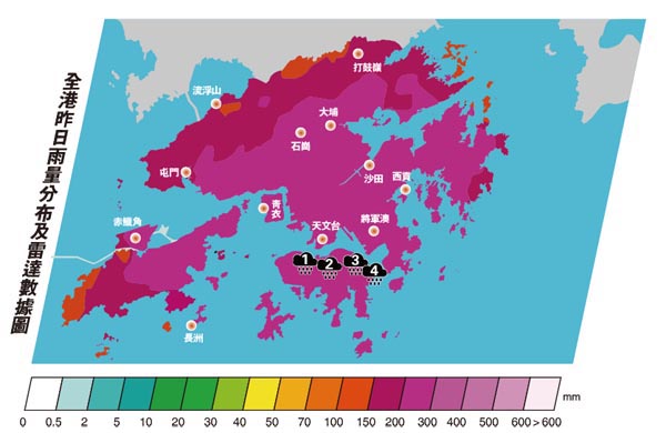 受熱帶風暴「獅子山」及東北季候風夾擊,香港天文台發出黑雨警告,是有記錄以來第二個「十月黑雨」,降雨量更打破歷來10月單日紀錄,全港多處大水浸,港島廣泛地區頓變成澤國,半山巨型棚架倒塌,一名女工命喪棚架下;巴士變潛水艇,在路上乘風破浪;柴灣坑渠「井噴式」噴水……市民出入狼狽不堪。今次「災情」最嚴重的半山、灣仔及柴灣等並不在渠務署水浸黑點名單上,多名渠道及工程專家昨日接受香港文匯報訪問時指出,除了降雨量太集中在港島外,渠道設計的盲點,以及垃圾積聚都是水浸三大元兇,建議擴大地底沙井理順水流,避免大量雨水溢出路面,並加強清理馬路排水道入口。 ●香港文匯報記者 高俊威