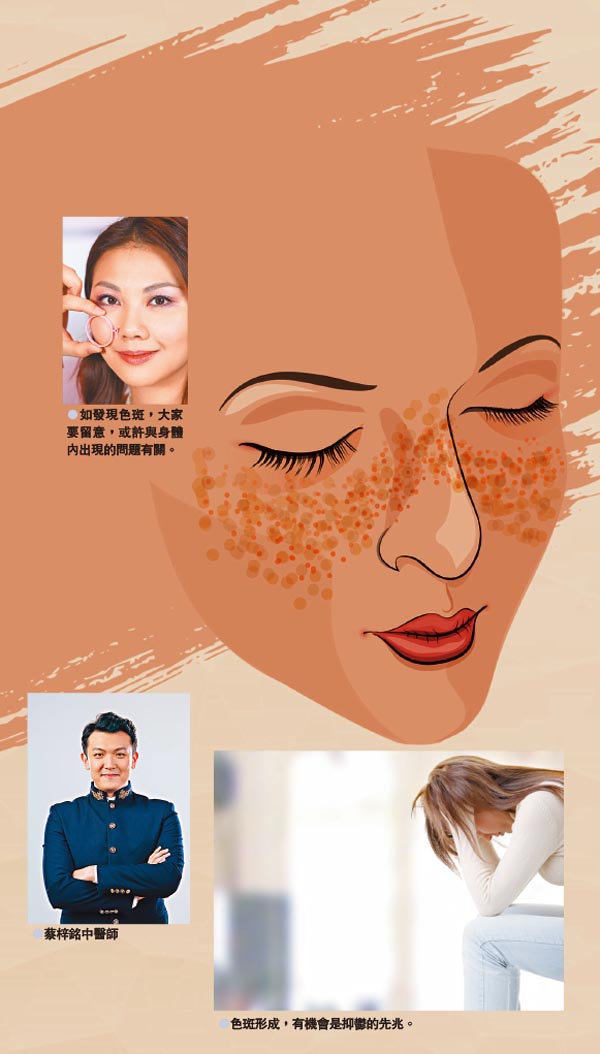 隨手翻開報章雜誌,或者在視聽媒體廣告上,都不乏淡斑、擊退色斑的產品廣告,尤其年輕男女們對去除自己面上的種種斑點可謂費盡心思。然而,很多時候對付色斑又並不是單單使用一些防曬美白的產品就能徹底解決。其實,在中醫角度,又是怎樣認識色斑的?色斑又會是一種病理表現、一種身體的警號嗎?色斑與人體內在其實是息息相關的,如長期情緒抑鬱或是飲食不規律容易令氣血阻滯,最後生成色斑。針對色斑的生成,我們不僅不能後知後覺,最重要是準確定位各種色斑所代表的問題,更要能在未形成或剛形成色斑之際,認清箇中病因,調整心情、作息、飲食,讓身體時刻處於趨向平和的狀態,就能在身體問題剛萌芽時及早將它調整過來。