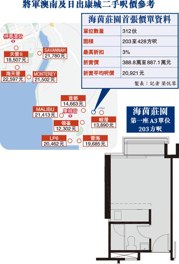 施政報告後新盤魚貫登場,提供1,556伙、樓花期約10個月的九龍建業旗下將軍澳海茵莊園昨日公布首張價單共312伙,面積203至428方呎,扣除最高3%折扣,折實平均呎價20,921元,貴絕將軍澳以至日出康城首批開盤呎價,但比同區同類型單位二手呎價低約5%。項目最細單位面積183方呎,也細絕康城,不過今次價單推出的最細單位為203方呎開放戶,折實入場費388.8萬元,為自2008年2月長實首推日出康城第1期首都單位入場費328.1萬元後,13年來區內最平新盤。 ●香港文匯報記者 梁悅琴