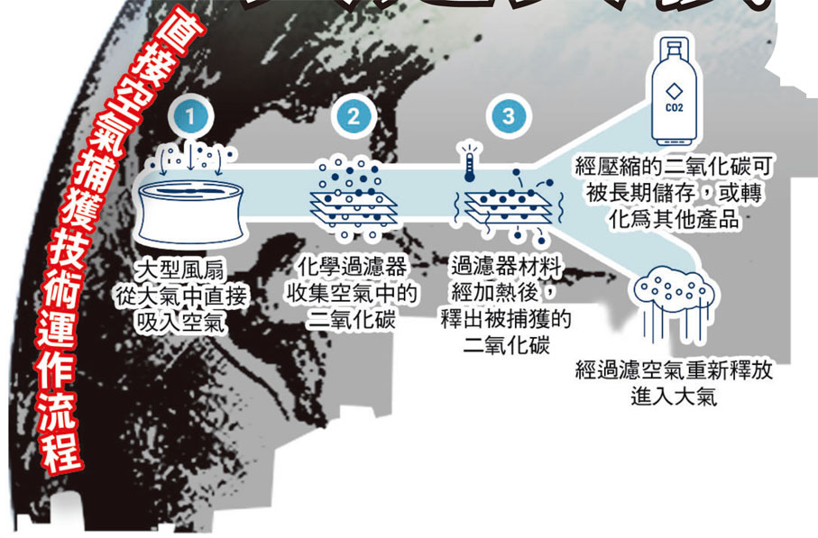 二氧化碳是造成全球暖化的元兇之一,社會討論減排多年,成效普遍未達預期,全球平均氣溫上升似乎已成定局,只差在升幅有多高。科學家則研究從另一方向入手,直接從空氣中收集二氧化碳,即進行「碳捕集」,雖然相關技術需動用大量資源及金錢,不過專家推算,若不應用碳捕集技術,國際社會必然無法履行《巴黎協定》的承諾。 ●香港文匯報記者 林文佑