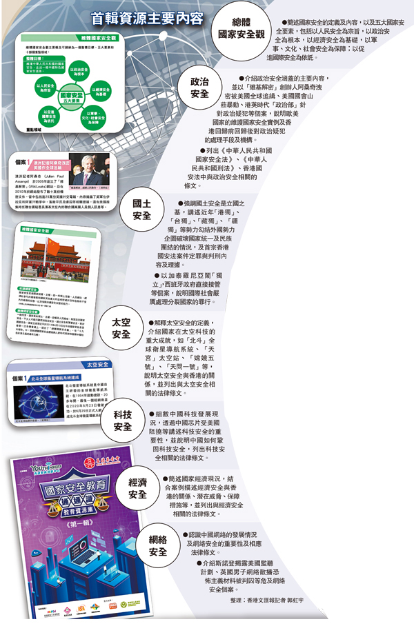 為幫助師生更好地掌握國家安全教育,理清知識盲點,善德基金會及青識教育發展中心本月起推出「國家安全教育通通識」系列活動,並於昨日的開幕禮推出第一輯逾50頁的教育資源庫,焦點選取了七大國家安全重點範疇,透過法律條文與概念,圖文並茂為師生深入淺出地詮釋相關內容。教材並以「維基解密」、美國國會山莊暴動、西班牙「加獨」等個案作例,說明每個國家都會嚴肅處理危害國安事件,又透過國家航天工程近年成就、斯諾登揭露美國監聽計劃等內容,引導師生學習太空安全、網絡安全領域的相關知識,更貼身地了解國家安全的重要性。●香港文匯報記者 郭虹宇