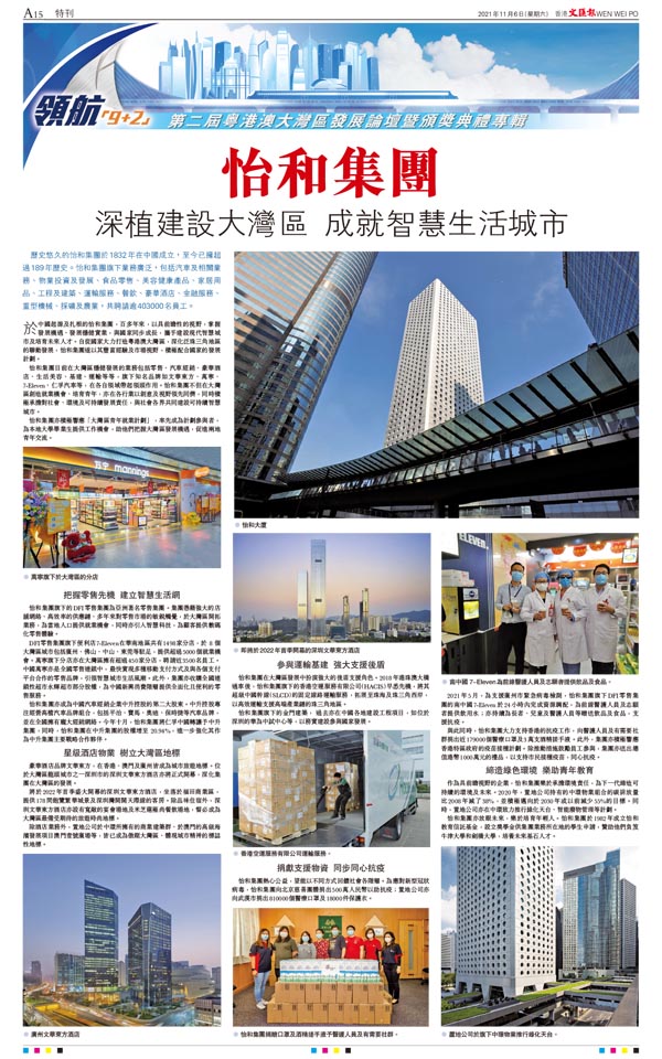 怡和集團目前在大灣區穩健發展的業務包括零售、汽車經銷、豪華酒店、生活美容、基建、運輸等等,旗下知名品牌如文華東方、萬寧、7-Eleven、仁孚汽車等,在各自領域帶起領頭作用。怡和集團不但在大灣區創造就業機會、培育青年,亦在各行業以創意及視野領先同儕,同時積極承擔對社會、環境及可持續發展責任,與社會各界共同建設可持續智慧城市。