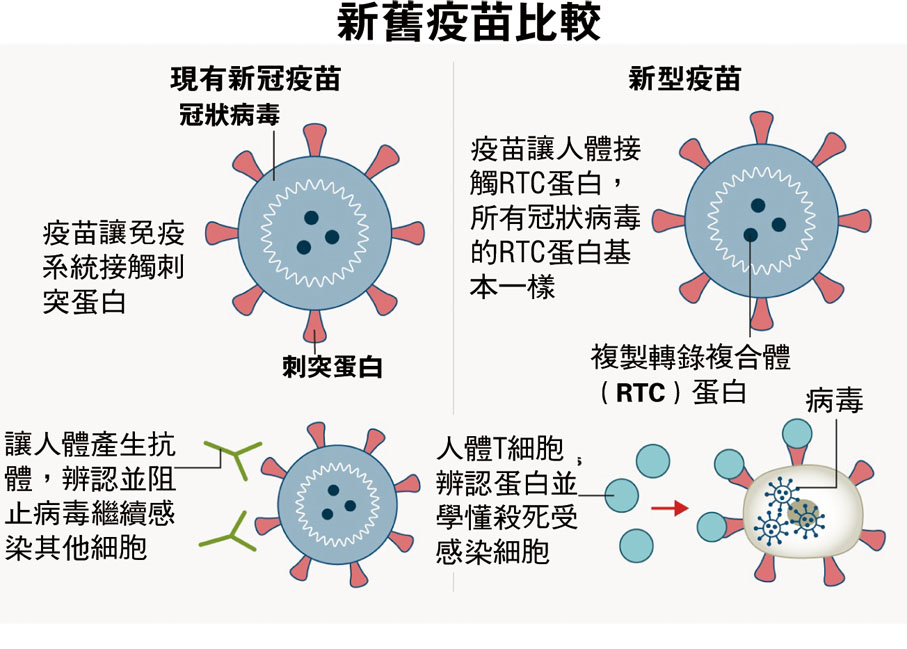 馬伊尼表示,若能研發一款針對RTC的新型疫苗,用於誘導T細胞辨認RTC,並殺死受感染細胞,相信還可識別其他感染人類的冠狀病毒。科學家認為現時採用信使核糖核酸(mRNA)技術的新冠疫苗經改良後,便可達到這個要求,馬伊尼指出,這款新型疫苗可同時針對刺突蛋白和RTC,讓接種者產生大量抗體和T細胞,日後能預防多種冠狀病毒。 ●綜合報道