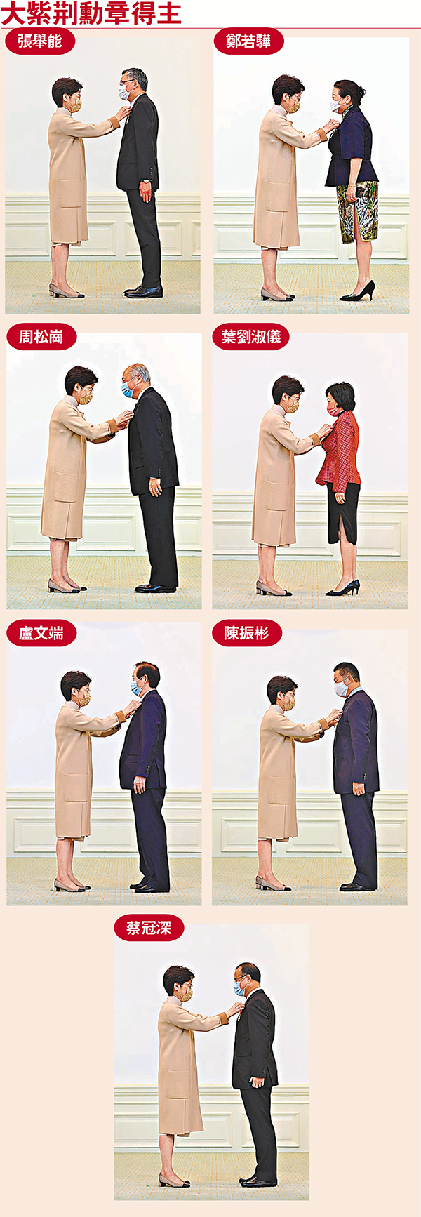 2021年度勳銜頒授典禮昨日起一連3天在禮賓府舉行,香港特區行政長官林鄭月娥主持。昨日首日有157人獲頒授勳銜及獎狀,其中7人獲頒大紫荊勳章,包括特區終審法院首席法官張舉能、律政司司長鄭若驊、市建局主席周松崗、行政會議成員葉劉淑儀、全國僑聯副主席盧文端、觀塘區議會前主席陳振彬,以及全國政協常委蔡冠深。林鄭月娥並向早前追截走私快艇時墮海殉職的總督察林婉儀追授金英勇勳章,表揚她英勇及無私精神。