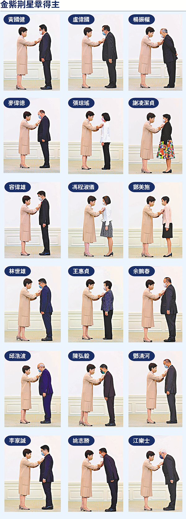 獲頒金紫荊星章的18人,包括工聯會議員黃國健、經民聯主席盧偉國、西九文化區管理局行政總裁馮程淑儀、基本法委員會委員陳弘毅、恒基地產主席李家誠等。
