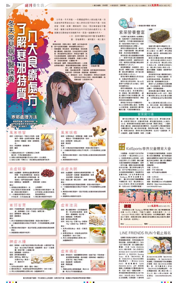 立冬後,冬天來臨,一些體質虛寒的人都如臨大敵,因為當他們受寒後往往比一般人更易出現不同的不適,包括感冒、咳嗽、眩暈、關節痛等,因此,現在筆者會從中醫角度,簡單介紹寒邪的特性及冬天常見病的處理方法,希望讓各位讀者能有效順應天時,度過一個健康的冬天。 ●文︰香港中醫學會註冊中醫 彭愉康博士 圖︰ 彭愉康博士、資料圖片、網上圖片