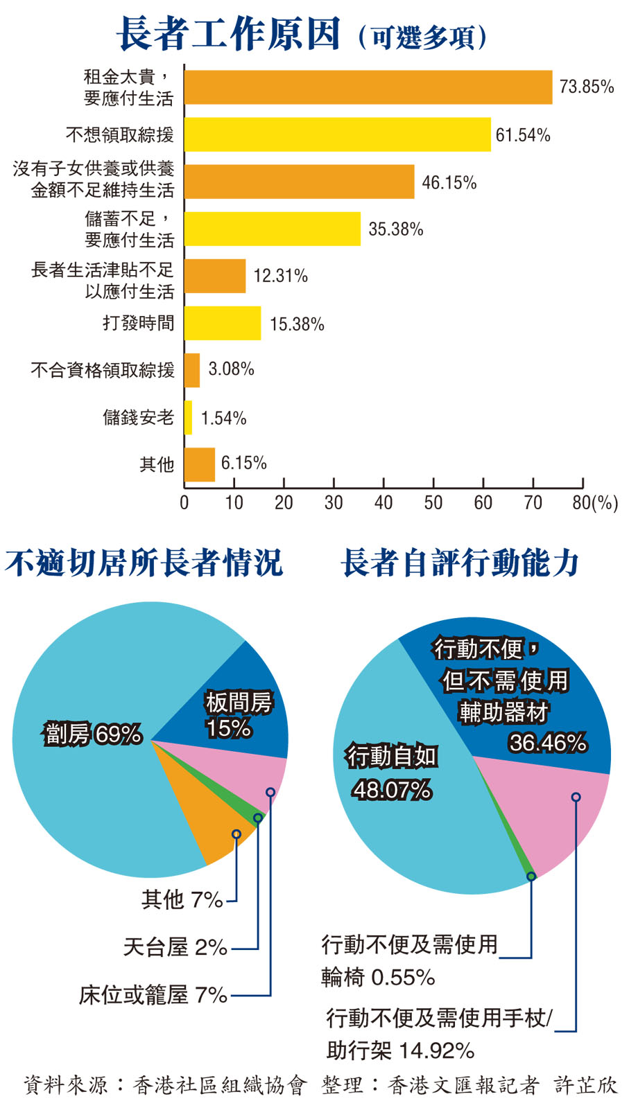 昨日是一年一度的長者日,宣揚「老有所養、老有所居」的精神,但香港仍有不少基層長者的居住環境極差,上樓遙遙無期,未能過「安居養老」的生活。 一項針對居於不適切居所的長者的調查發現,受訪長者輪候公屋的時間過長,他們現時的居所租金中位數高達3,550元,遠高於現時綜援一人租金津貼的2,515元。調查並指40%受訪長者「超租津」,只能外出工作或抽出積蓄以支付租金。負責調查的社區組織協會指,長者居所普遍安全隱患大,跌倒情況嚴重,而因「體恤安置」計劃審批準則嚴苛,不少體弱、貧窮長者沒法申請成功而加快上樓,促請政府正視並解決有關問題。●香港文匯報記者 文森
